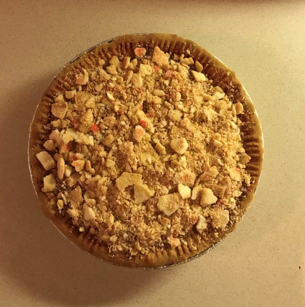 Snickerdoodle cookie crust with an apple filling and snickerdoodle cookie crumble on top.